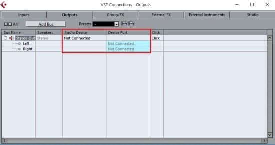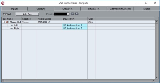 VST Connections 윈도우에서 윗줄에 위치한 Input, Output 탭은 실제 오디오 인터페이스와