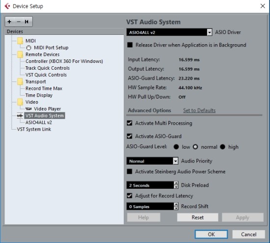 이 창에서 중요한 것은 Devices 목록에 위치한 VST Aduio System 입니다. 이를 클릭하면