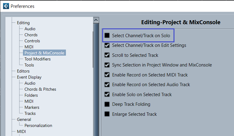 Edit => Preferences => Editing => Project & MixConsole => Select Channel/Track on Solo 체크