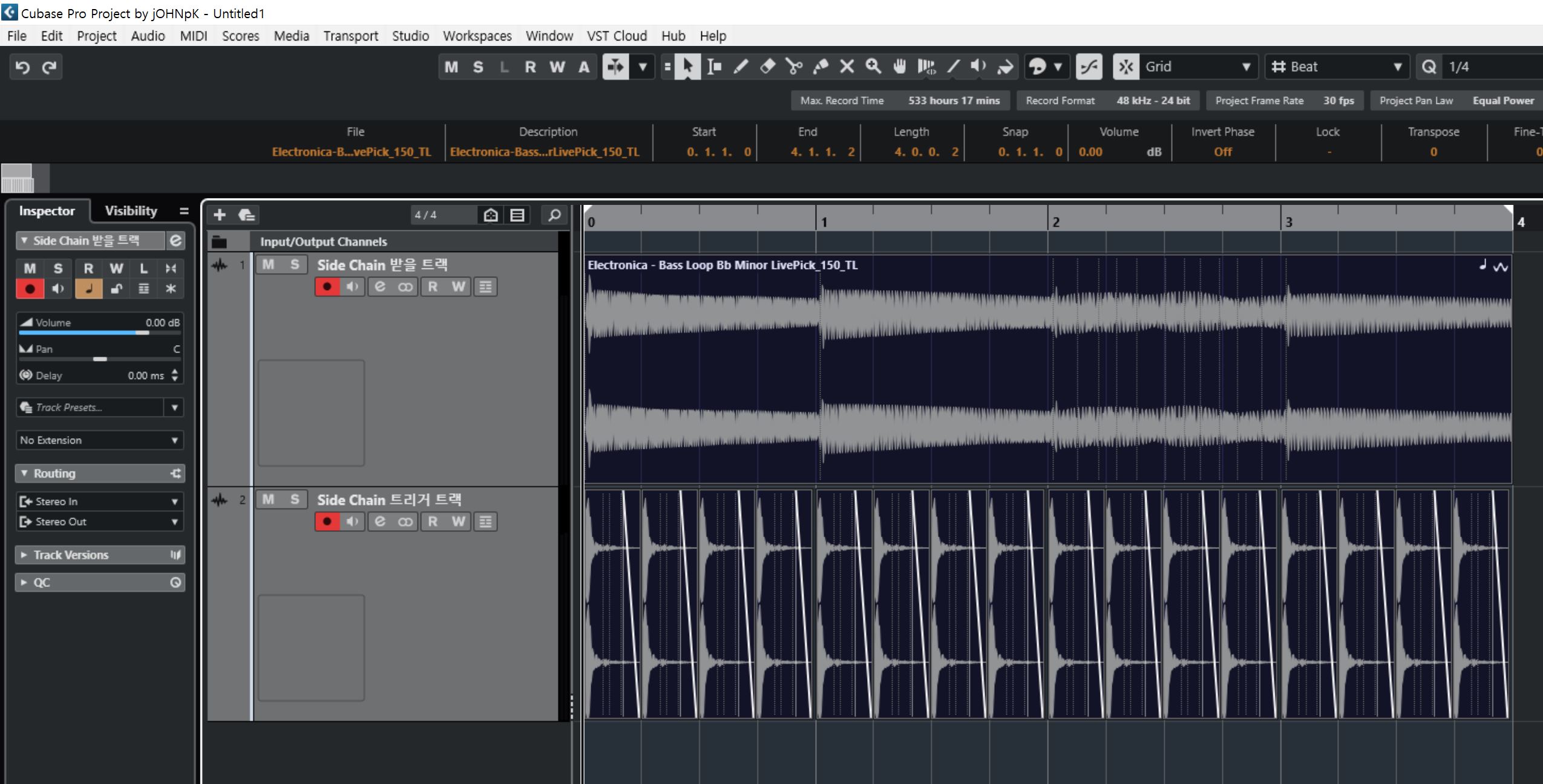 프로젝트를 재생하며 Side Chain 효과를 확인합니다. 원하는 효과가 나오지 않는다면 다음을 확인해 보세요: