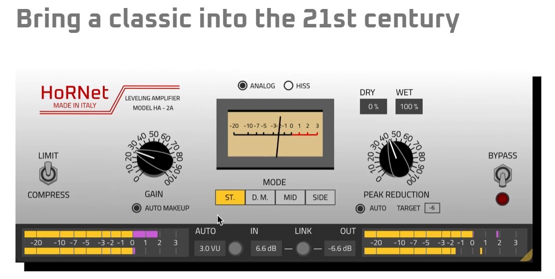 HA2A는 전설적인 LA-2A 옵토 컴프레서를 모델링한 플러그인입니다. 따뜻한 진공관 질감과 자연스러운 다이내믹 컨트롤로 유명한 장비죠. Hornet은 이를 최대한 심플하게 구현하면서도, 현대적인 편의 기능을 더해 누구나 쉽게 사용할 수 있는 무료 플러그인으로 배포하고 있습니다.